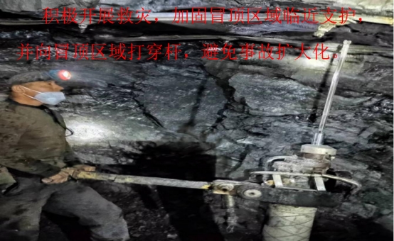 兼职救护1小队着装携带装备、仪器、通信器材集结后迅速入井组织开展救援救护工作,到达现场后利用现场现有物料,加固冒顶区域临近支护,并向冒顶区域打穿杆,避免事故扩大化。