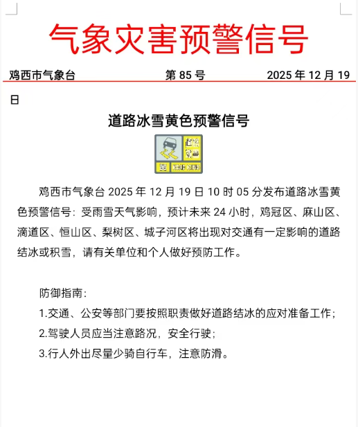 20251219道路结冰黄色预警